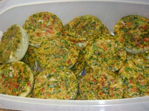 Another excellent option, and a definite crowd pleaser: Egg Cupcakes a.k.a. Omelet Muffins. This is a great basic recipe that can be altered to your taste, or what you have on hand. For instance, in lieu of jarred red peppers, I have often used diced tomatoes. I also like to add 1/4 c of mayo to the “batter” for a creamier texture. Be creative–use your pantry/refrigerator herbs and spices to give them a new life: use diced green chilies and 2 tbsp cumin for a Mexican kick; add a handful of torn basil for a fresh change. Here is a picture of my recent batch: