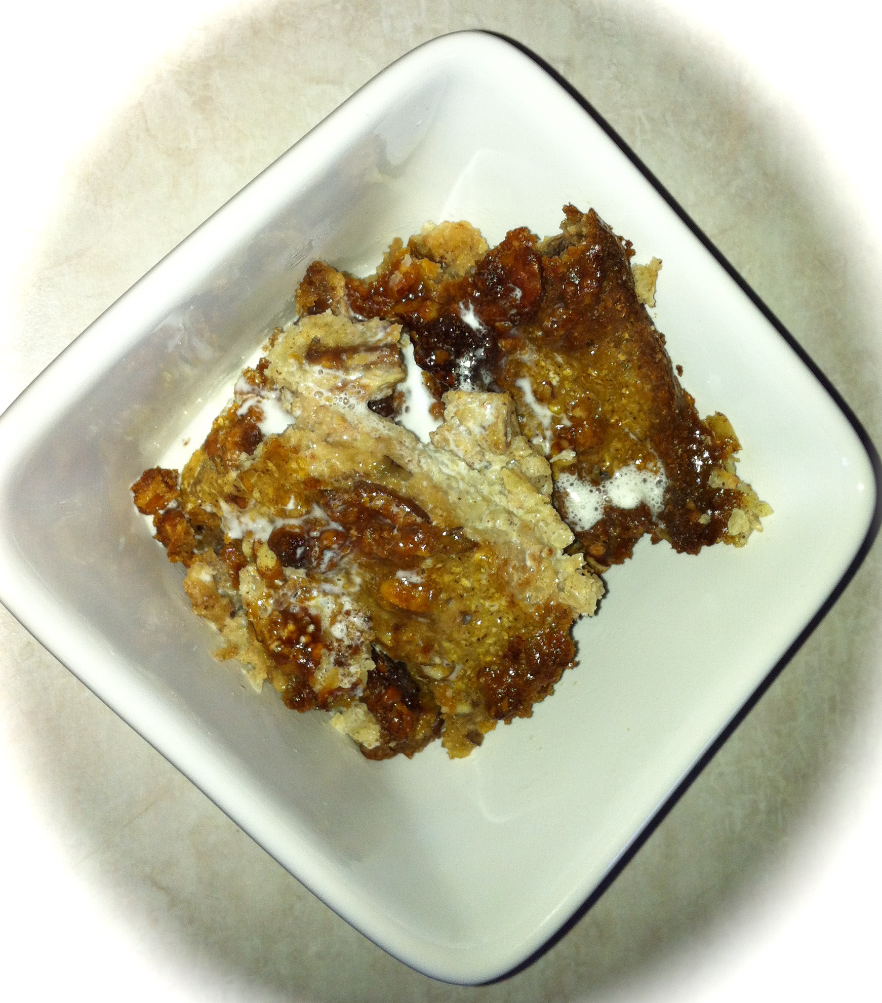 Bake for 35-40 minutes until pudding base is firm. Slice and serve with a drizzle of heavy cream. Yum!