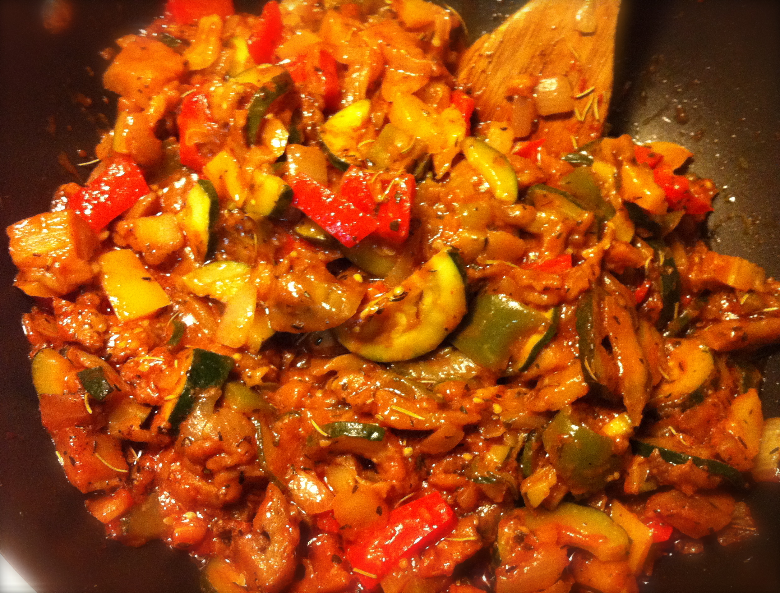 Heat olive oil in large skillet over medium heat. Add chopped onion and garlic and sauté until softened, but not browned. Add the remainder of the veggies and sauté, 5-10 minutes, mixing gently. Add all herbs, and continue to sauté until veggies are very soft, 10-15 minutes. Add in extra olive oil in small amounts as necessary to keep everything moist. Stir in tomato paste until well distributed and heated through. Season to taste with salt and pepper and serve!