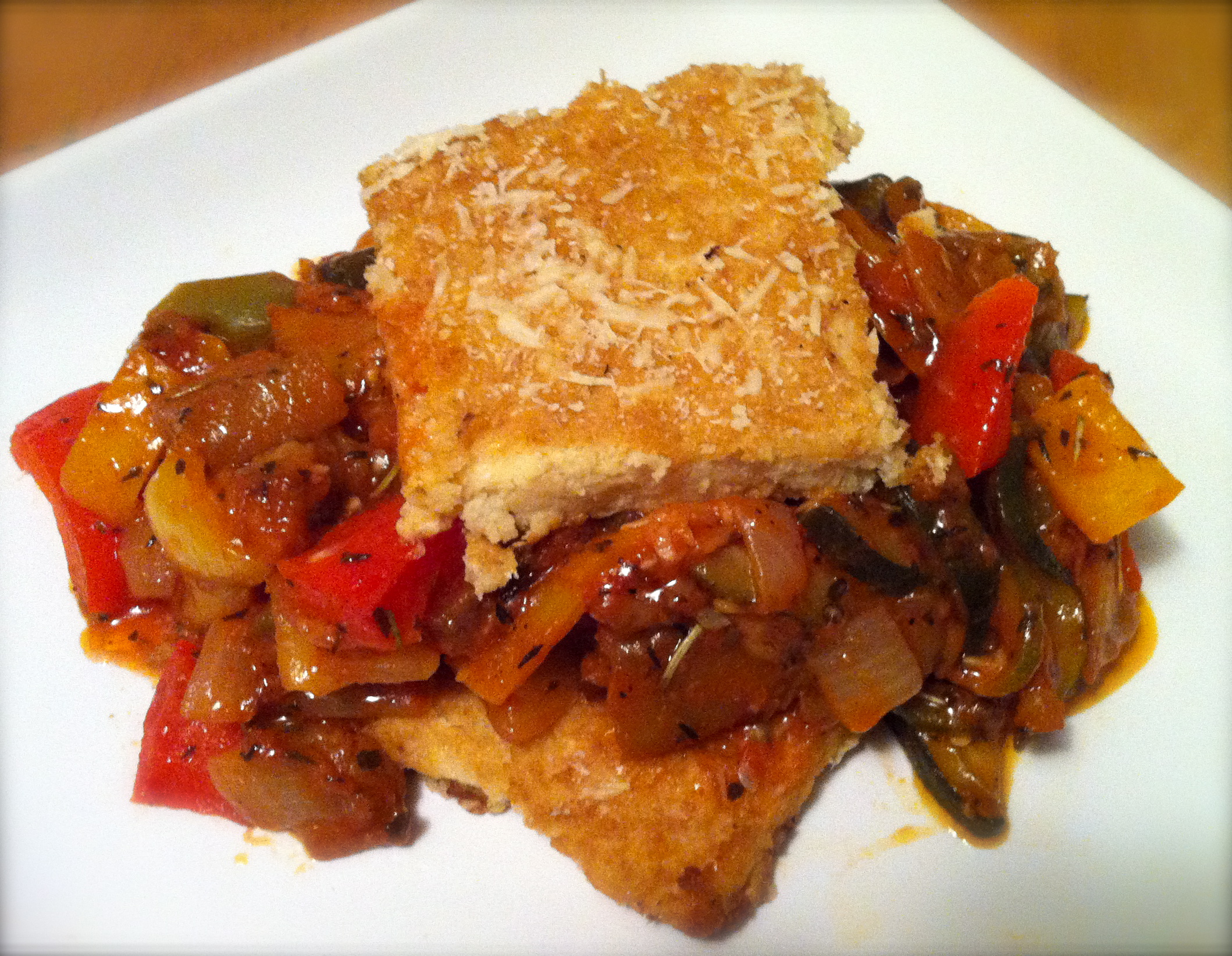 Preheat oven to 350. Heat olive oil in large saucepan, add riced cauliflower and cook on medium heat for approximately 10 minutes. Remove from heat and mix in remaining ingredients. Line a 9×13 baking pan (or, 8×8 depending on the size of your cauliflower) with lightly greased parchment paper. Spread cauliflower mixture on pan about 3/4-1in thick (as pictured above). Bake for 25-30 minutes until slightly golden. Sprinkle with remaining parmesan cheese, bake for 5-10 more minutes. Cool slightly, cut into squares, and serve with ratatouille!