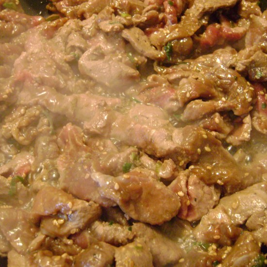 **My grocery store labeled the meat as for “Rouladen.”  Basically it is sirloin roast sliced paper thin.  You can see more awesome Bulgogi how-to photos here.  This recipe was given to me by my friend Amy.