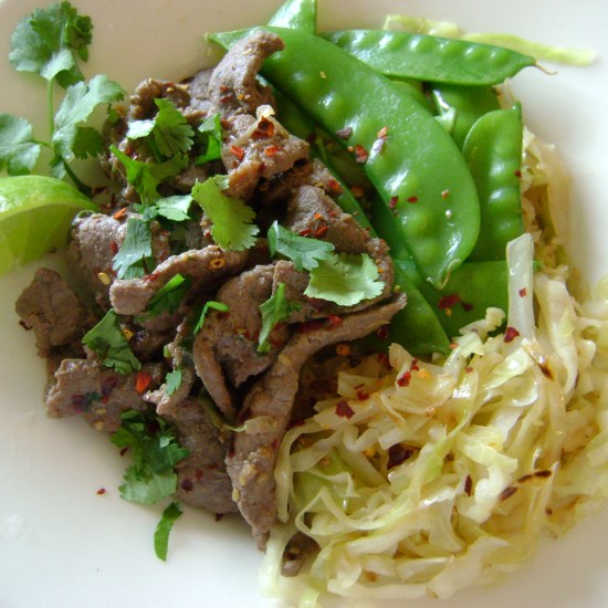 Serve over thinly shredded cabbage.  I sautéed mine in coconut oil, then seasoned it by tossing in a few shakes of soy sauce, 1-2 tsps of sesame oil, and about 1-2 tbsp sesame seeds.