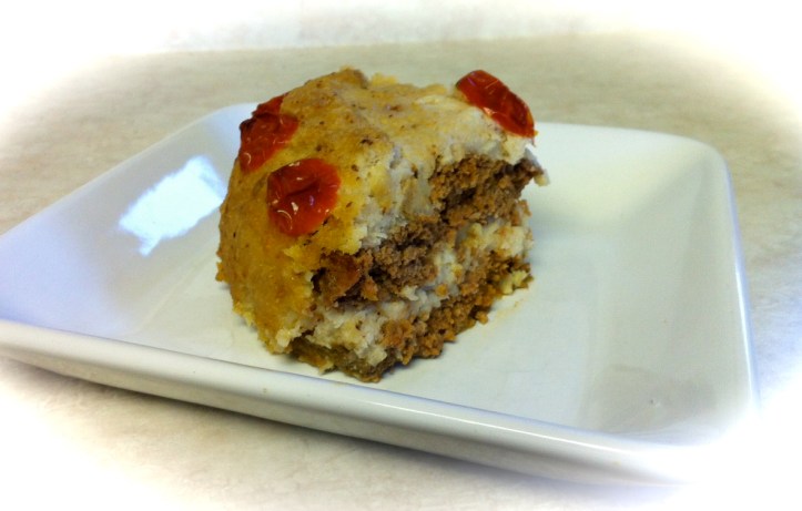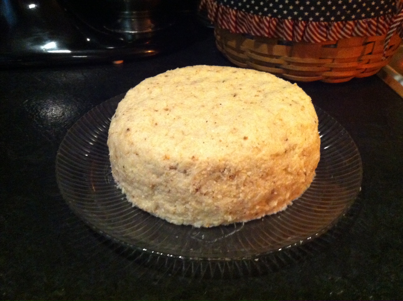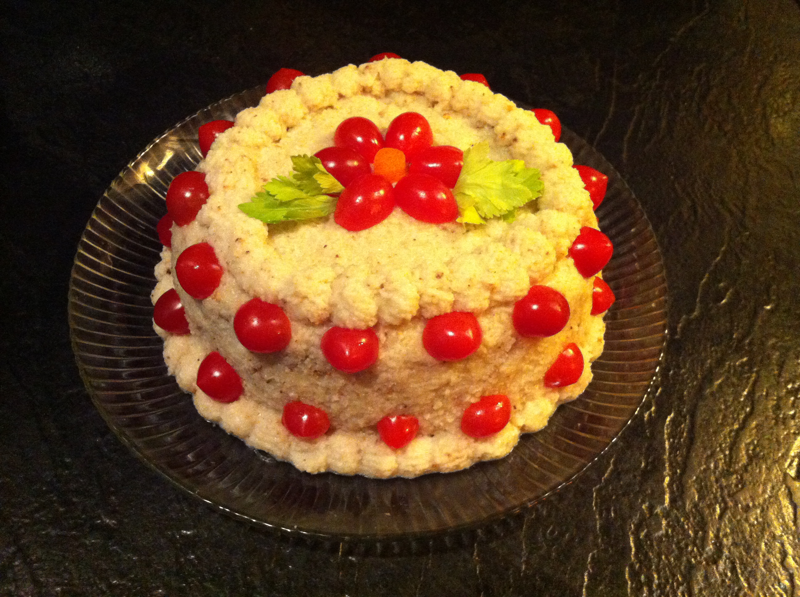 My mom and I had a blast today playing little pranks with the kids…from drinks you can’t sip (jello!) to teeny tiny breakfast plates to fake broken arm casts. While we were browsing for the prank ideas, I stumbled across this “cake” and thought, “now, that could be one perfectly primal cake.”  Here is my version of the April Fools dinner “cake”.  Enjoy!