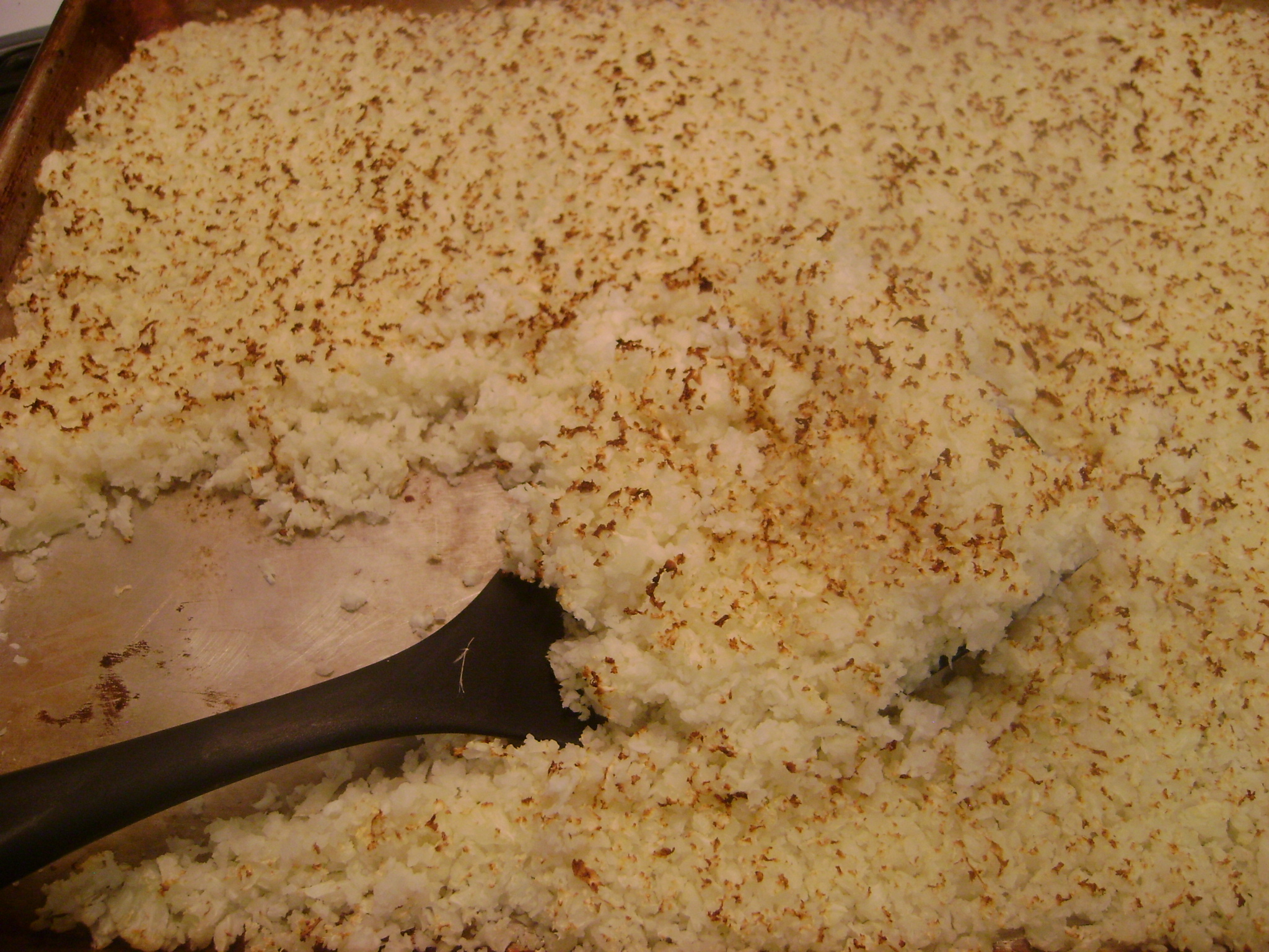 Place under broiler, and watch it until it is toasted on top. Remove from oven, toss the cauliflower, and redistribute over the pan, re-toast.