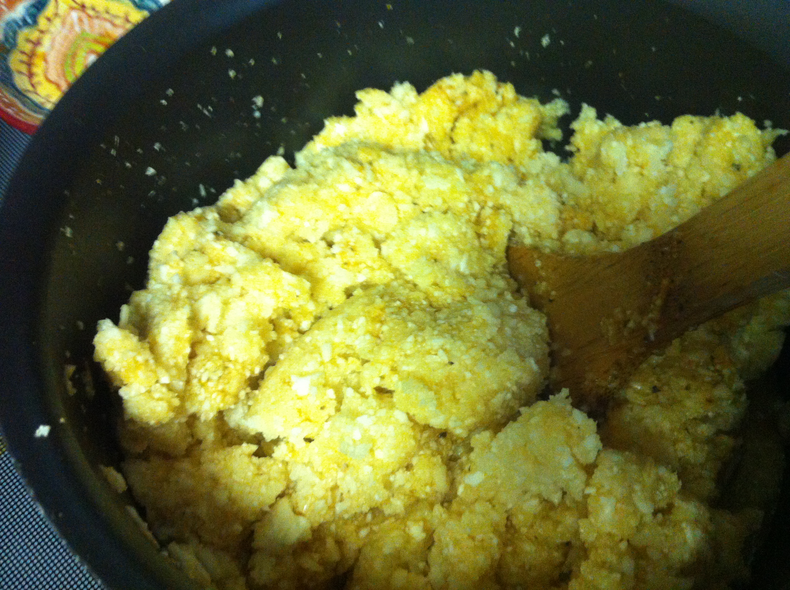 Heat about 1 Tbsp of oil of your choice in medium pot. Add riced cauliflower and cook for 5-10 minutes until done, adding spoonfuls of juice from the curry mixture, salt, and pepper to taste.