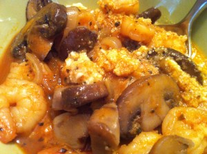 Add first three ingredients to skillet on medium-high heat. Cook for about one minute until mixture is combined and fragrant. Whisk in coconut milk until mixture is not lumpy. Add peppers, onions, and mushrooms and cook for about 5-10 minutes. Taste and add more curry paste depending on the level of spiciness you prefer. I ended up using about 4 Tbsp after all was said and done. Add shrimp and cook until heated through.