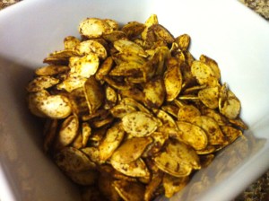 - Mix about 1 Tbsp melted coconut oil and 1 tsp cinnamon with reserved pumpkin seeds (no need to rinse or clean off excess pulp).