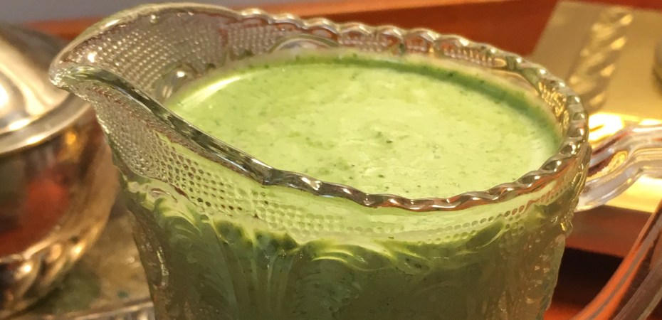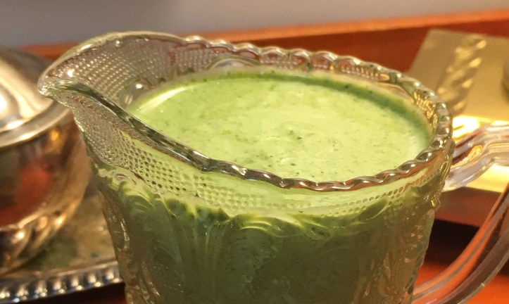 Place ingredients in a blender/food processor  in the order listed.  A Vitamix will make it velvety smooth…If you don’t have a Vitamix there will still be bits of unpulverized herbs, but it will still taste amazing!