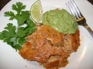 Season the chicken generously with cumin and chili powder (1-2 tbsps each). Saute or boil ground cauliflower until done. (Use the same method described in my original breakfast casserole.) Drain and set aside. In a large bowl, lightly whisk the eggs, then add in the green onion, chilies, salt, garlic powder, pepper and lime juice. To that mixture add in the cooled chicken, cauliflower, and enchilada sauce.