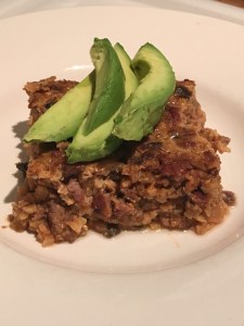 Saute the onion and mushrooms until they are wilted and soft. Add the beef and saute until browned. Season the meat mixture with the cumin, chili powder, garlic powder, oregano, and salt. Stir in the enchilada sauce and lemon juice. In a large bowl, add the beaten eggs to the (cooled) cauliflower rice, then stir in the meat mixture. Mix well, and pour into a prepared 9×13 pan. Bake at 350 degrees 40 minutes or until the center is set.