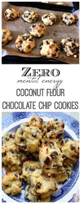 Preheat oven to 350. Line a baking sheet with parchment paper. In a medium bowl, whisk all ingredients together except the chocolate chips. The batter will thicken as the coconut flour absorbs the moisture. Stir in the chocolate chips. Makes 24 small cookies. Use a spoon to drop the cookie dough onto baking sheet, and use your fingers to form them into balls, or to flatten them slightly.