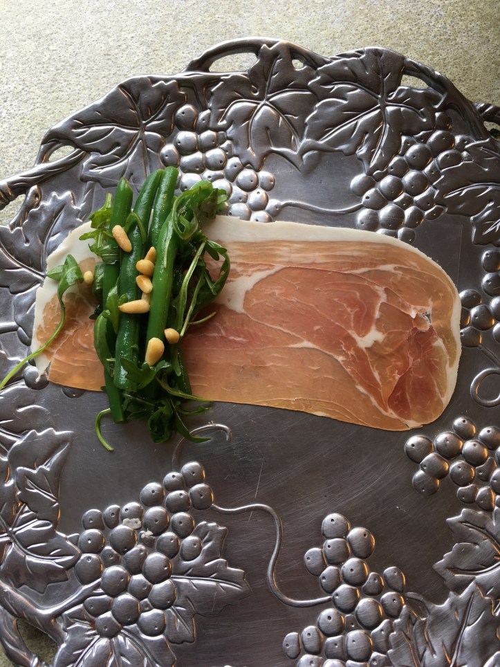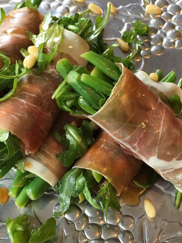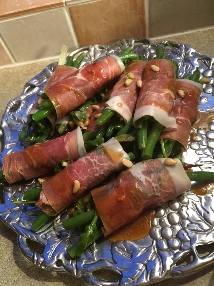 Combine the beans with the leaves, pine nuts and parmesan. Drizzle with the olive oil and lemon juice, then season to taste. Lay out the prosciutto slices, put a handful of bean mixture on each, then roll them up. Drizzle with the balsamic dressing just before serving. Makes 6.
